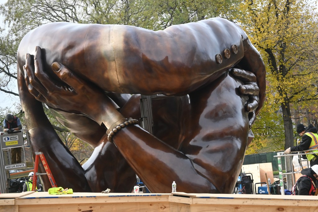 Workers installing “The Embrace” by Hank Willis Thomas in the Boston Common. The sculpture celebrates the life of Rev. Martin Luther King, Jr. and his wife, Coretta Scott King.